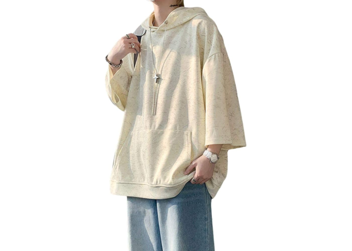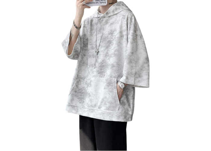中心窩メンズ パーカー 夏服 七分袖 Tシャツ 大きいサイズ ゆったり おしゃれ タイダイデザイン フード付き 薄手 涼しい素材 アウトドア カジュアル ポケット付き プルオーバーシャツ